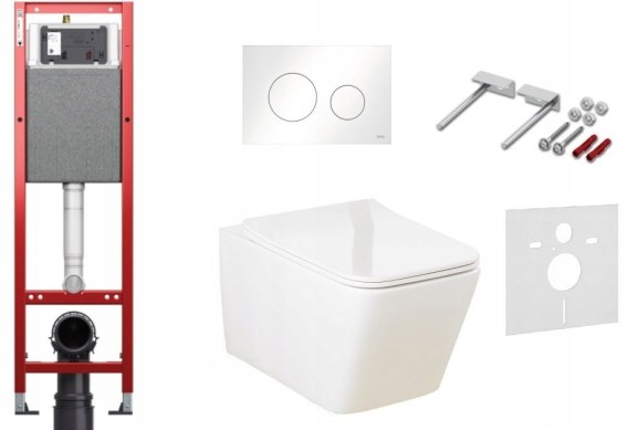 Elementem aukcji jest zestaw wyposażenia łazienki składający się z 6 artykułów, tj. stelaż podtynkowy, miska WC wisząca typu RIMLESS, deska wolnoopadająca, przycisk spłukujący, przegroda tłumiąca oraz wsporniki montażowe.